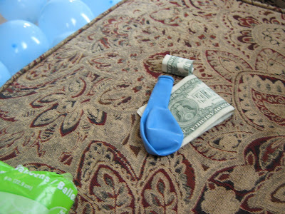I'm not quite ready to give up on games, altogether. So, I gave him his present...in ones...folded up...inside of balloons.