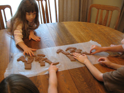 I transferred the shapes to cookie sheets, and cut them up into pieces, beginning with a letter "D" (using a cutter from the Alphabake set), in the middle. The first puzzle, I cut simply, with straight lines. But the second two dinosaurs, I cut into curvy, puzzle piece kind of designs.