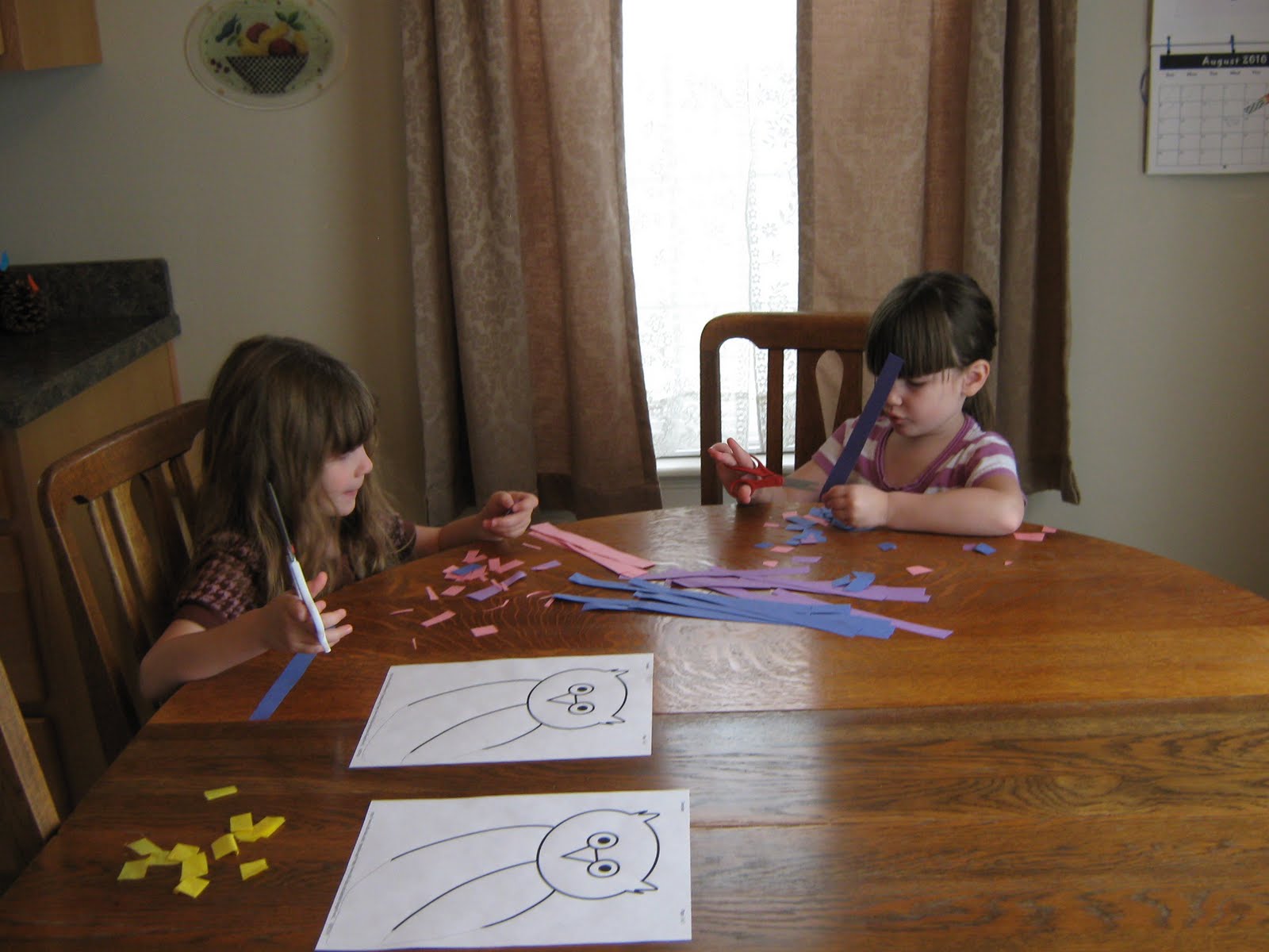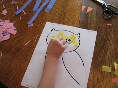 I found an easy owl craft, and printed the template to go with it. Then, I gave the girls some strips of paper to snip up into small pieces.