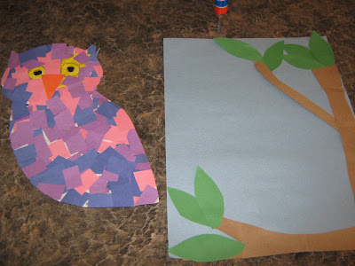 ...and glued them to blue construction paper, summer tree backgrounds, I had prepared, while they were cutting, and gluing their owls.