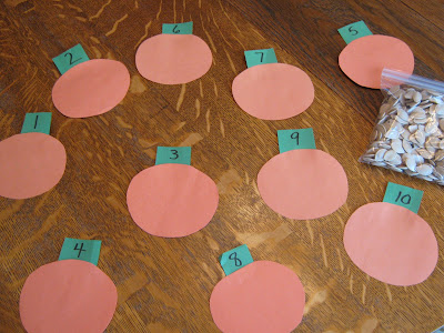 This was great for the older children, but dealing with over 1000 seeds (from two pumpkins) was overwhelming for my 4 year. So for her, I went with an idea from Dr. Jean's Pumpkin Page, for pumpkin seed counters...