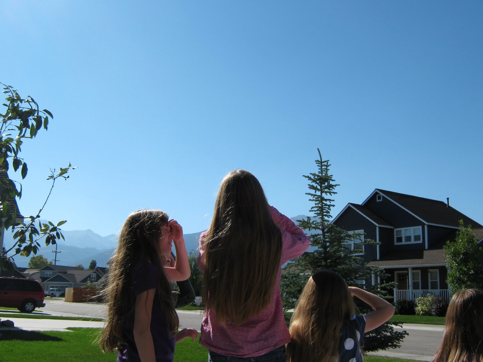 The top of the mountain above is over 8,000 feet, and the ones below are higher, with ify roads heading that high, on those particular peaks. I'm not sure if the minivan will make it up to them, though I think we'll try, because spotting a turning larch is on our fall leaf-list. Just in case, I ran the kids out front, with binoculars in hand, to make sure everyone got a good look.