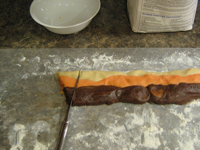 I've seen variations around a few places, but to make our candy corn cookies, we turned, as usual, to sugar cookie dough. Dividing a batch into thirds - one left plain vanilla, one with red, and yellow food coloring added, and one mixed with 1/4 cup of melted chocolate chips, because we were out of baker's cocoa (horror of horrors!).