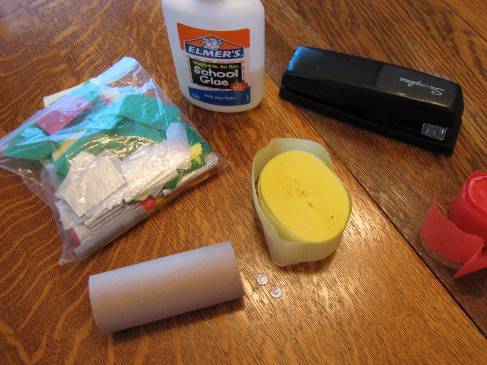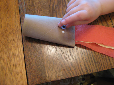 For ours, I had the girls cut strips of yellow, and red, crepe paper, streamer "flames", which I stapled into the front of a toilet paper tube, closing that end of the tube in the process.