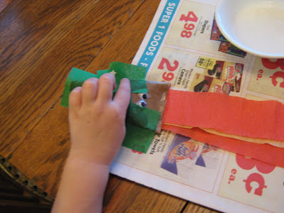 Finally, they painted the bodies with watered down glue, and stuck on squares of green tissue paper.
