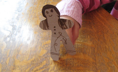 Then, I gave them a couple of gingerbread men puppets, to decorate. I made them, by cutting the gingerbread men shapes, with elongated legs, out of an empty cereal box.