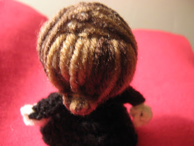 Finally, I trimmed all but two of the pieces sticking out. I used those pieces to wrap around the base of the bun, to hide the trimmed ends, and then wove the final ends into the puppet, under the hair.