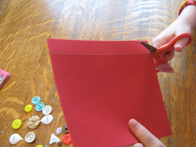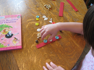 If the holes on your buttons, or bells will allow, you can let children sew the buttons, and bells on with a piece of ribbon, and a darning (not sharp) needle.