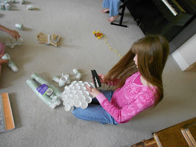 The younger children wanted in on the project too, but the stapler took more hand strength than they had to offer, so they kept busy stacking the cups...