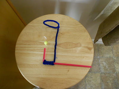 Finally we placed it in the bendy end of the straw, so the pipe cleaner hoop was standing over it, and blew through the other end.