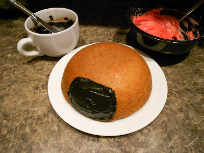 Spread a little of the chocolate frosting onto the front of the cake, with a butter knife, to make a semi-circular face.