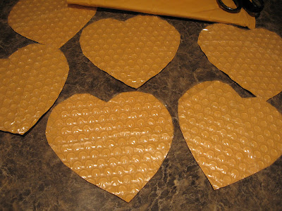 I traced around a large, heart shaped cookie cutter on the outside of the envelope, and cut through both sides of the envelope at once, giving me two hearts at a time, and making the whole process very fast and easy. The trick is to leave the envelope backing on the hearts. It helps keep the bubbles intact, but does not interfere with the popping fun.