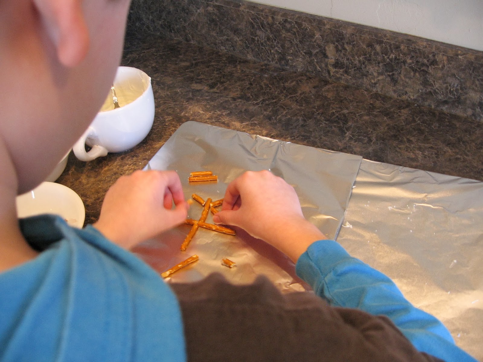 White chocolate hardens quickly at room temperature, making it a bit of a race for the children to get all their pretzel pieces dipped before the chocolate needed to be remelted, but also making for solidified completed projects ready to be transferred to plates in just about the same time it took to mix the hot chocolate.